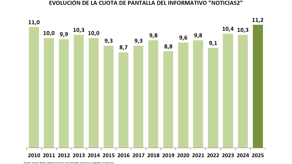 Noticias 2, con una cuota del 11,2%, consigue su mejor resultado anual desde 2009 con un crecimiento de 9 décimas sobre 2024. La media de audiencia conseguida ha sido en 2025 de 194.000 espectadores con un acumulado de promedio diario de 323.000 personas.
