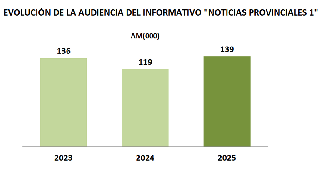 Los informativos provinciales destacan en sus datos el de sobremesa con el 9,1% y 139.000 espectadores de media, 20.000 más que en 2024, es decir un 16,8% más que en el año anterior. Se ha pasado también de 135.000 telespectadores de audiencia acumulada de promedio diario a los 181.000 de este año.