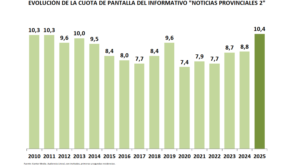 Y el 10,4% de cuota de pantalla de Noticias provinciales 2, la más elevada de los últimos 16 años. Con 212.000 espectadores de media y 274.000 de acumulada diaria.
