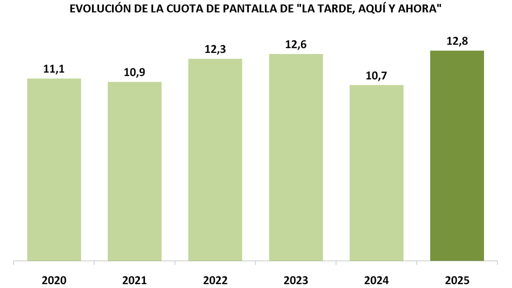 La tarde, aquí y ahora lidera su franja de emisión con su mejor resultado de los últimos 6 años al alcanzar una cuota de pantalla del 12,8% con una media de espectadores.