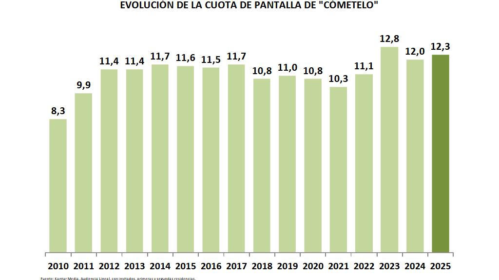 Cómetelo, por su parte, consigue su segundo mejor resultado de toda su historia con el 12,3% de share y 193.000 espectadores de media.