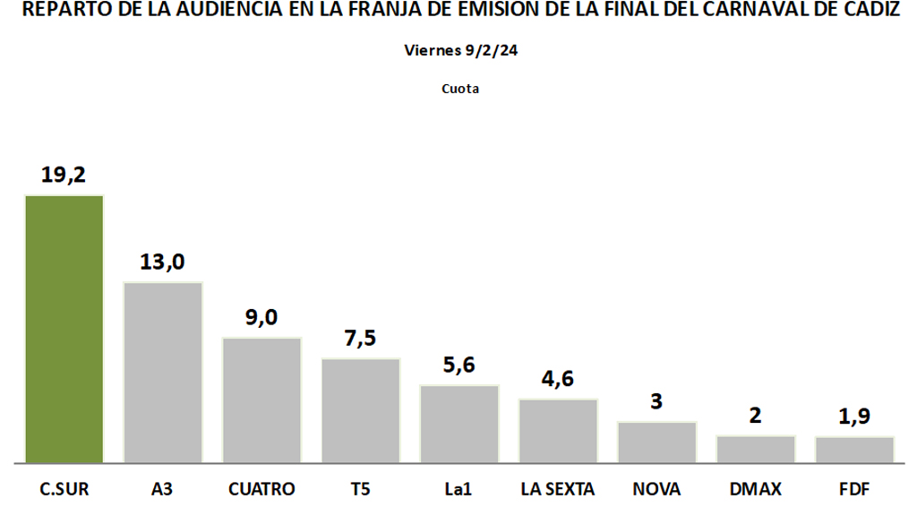 Canal Sur Televisión fue este viernes 9 de febrero, día de la Gran Final del Carnaval de Cádiz, líder de audiencia en Andalucía y entre todas las autonómicas con una cuota de pantalla del 14,9% en el total de la jornada.