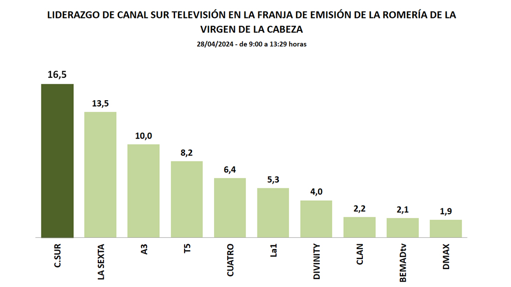 Canal Sur Televisión lideró las audiencias en Andalucía a lo largo de la mañana de este domingo 28 de abril con la retransmisión en directo de la Romería de la Virgen de la Cabeza, un programa especial que obtuvo el 16,5% de cuota de pantalla y convirtió a la televisión pública andaluza en líder absoluta con una audiencia media de 119.000 telespectadores y siendo seguida, en algún momento de la retransmisión, por 528.000 espectadores únicos.