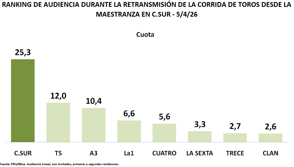 Este dato le ha permitido ser líder indiscutible en su franja horaria de emisión en Andalucía y entre todas las televisiones autonómicas, doblando al inmediato perseguidor. El festejo congregó una audiencia media de 517.000 espectadores, además fue visto, en algún momento, por 943.000 ciudadanos que viven en nuestra tierra. El minuto de oro de la corrida fue a las 21:01 horas con 580.000 espectadores y una cuota del 26,4%, alcanzado picos del 30% en la cuota de pantalla durante la retransmisión.