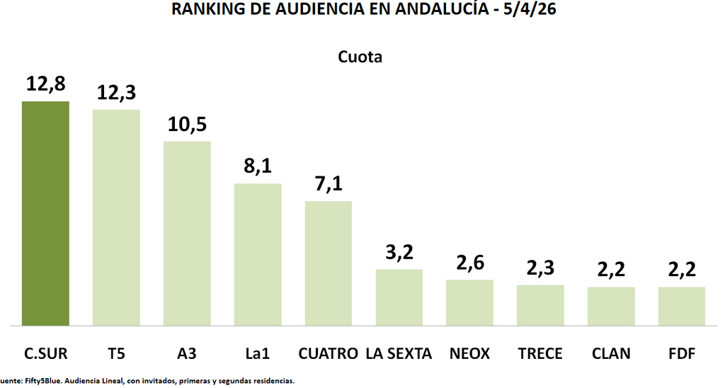 Además, Canal Sur TV fue líder de audiencia ayer domingo en Andalucía y entre las autonómicas con un 12,3% de cuota de pantalla.