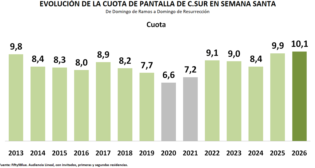 Desde el Domingo de Ramos al Domingo de Resurrección Canal Sur TV, con un 10,1% de cuota de pantalla, logra su mejor resultado en Semana Santa desde el 2012, siendo además la cadena pública predilecta de los andaluces y andaluzas esta Semana de Pasión.
