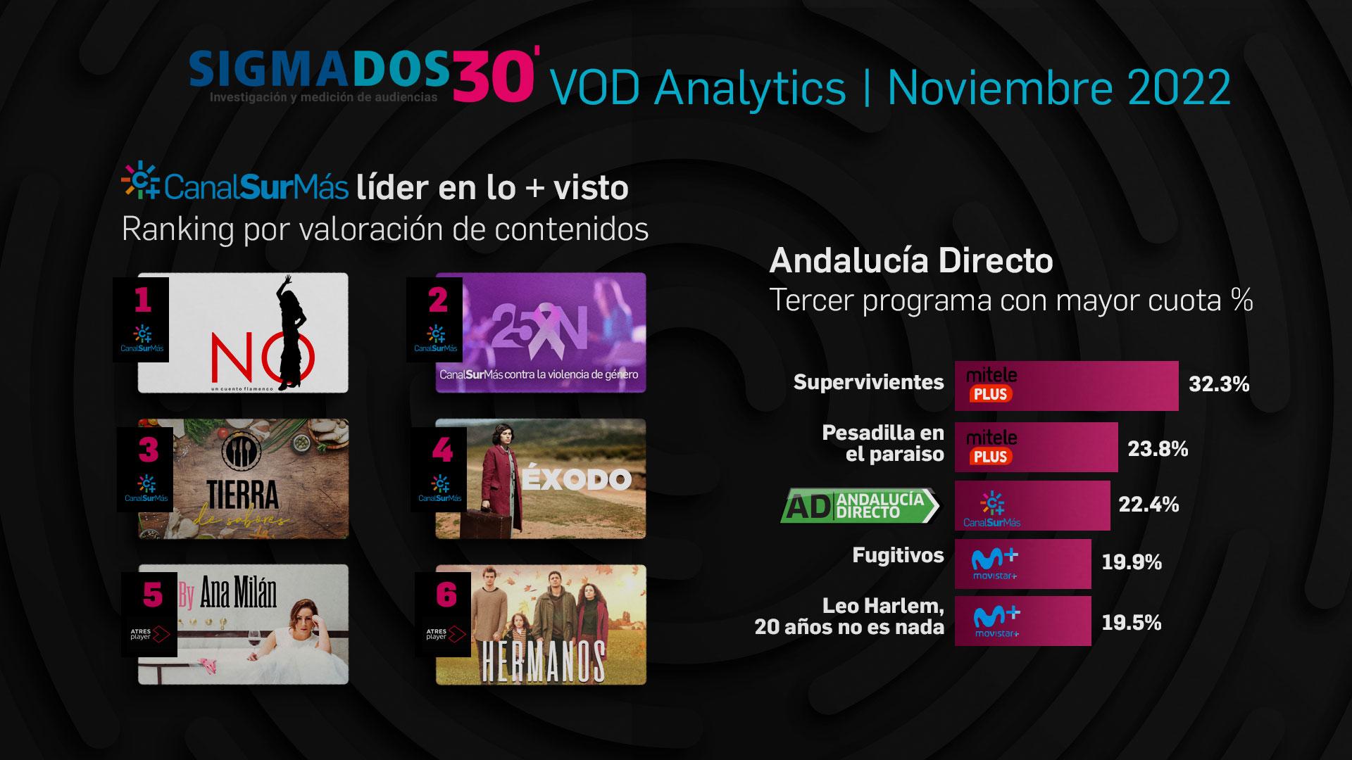CanalSur Más acapara los cuatro primeros puestos del ranking de valoración de contenidos del mes de noviembre según el panel que mide las plataformas VOD en España de Sigma Dos 30. La película "No, un cuento flamenco" llega al 10 de nota media entre los usuarios de la plataforma. Le siguen el Especial "25N: Canal Sur contra la violencia de género", con un 9,8; el programa "Tierra de sabores", con un 9,55 y la película "Éxodo", con un 9,37.