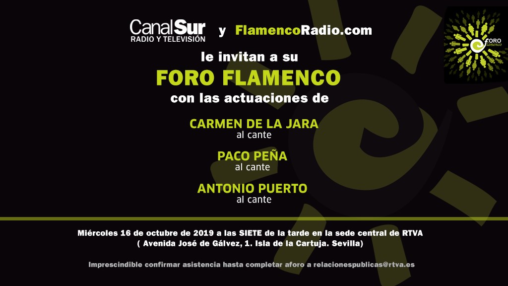 Canal Sur Radio y FlamencoRadio han celebrado este miércoles 16 a las 19:00 horas en la sala circular de la sede central de RTVA en Sevilla el "Foro Flamenco" del mes de octubre, que ha reunido a los cantaores Carmen de la Jara, Paco Peña y Antonio Puerto. La entrada ha sido libre hasta completar aforo, previa confirmación de asistencia.