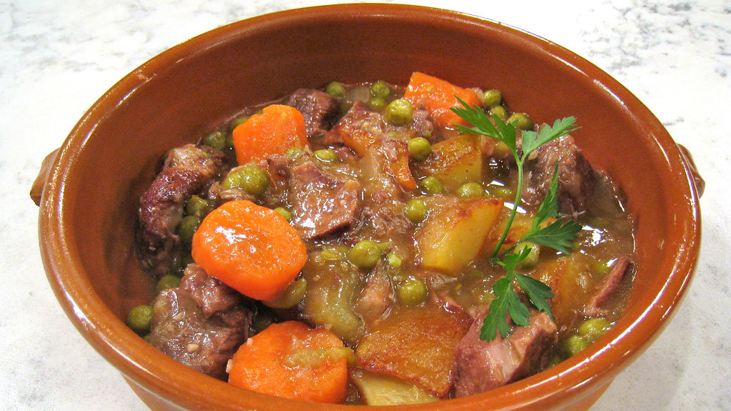 Elaboración: salpimentar la carne, pasarla por harina y dorarla. Apartar y reservar. En el aceite anterior, sofreír las cebollas cortadas en juliana junto con los ajos laminados y las zanahorias peladas y cortadas en rodajas. Cocinar unos minutos, añadir los tomates triturados y freír. Cuando el tomate esté bien frito, devolver la carne a la cacerola y verter el vino tinto. Dejar hervir brevemente y agregar unos 2 litros y medio de agua, los guisantes, 2 hojas de laurel y dos clavos. Salpimentear y dejar cocinar, unos 90 minutos, a fuego medio. Finalmente, cortar las patatas en dados y freírlos