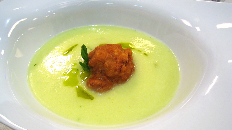 En la crema se empleará un melón piel de sapo, dos puerros, dos patatas medianas, una cebolla, un litro de caldo de ave, cuatro quesos en porciones, albahaca fresca, aceite de oliva virgen extra, sal y pimienta.