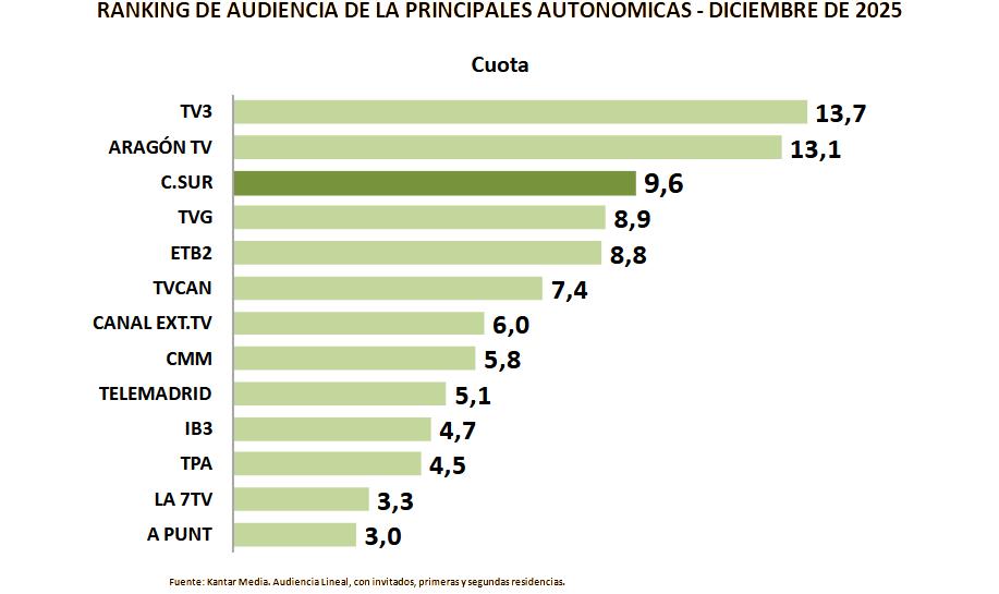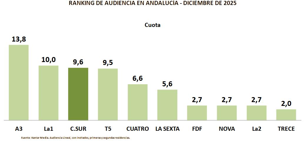 Canal Sur Televisión ha despedido el 2025 con un importante dato sobre las audiencias. En diciembre, la cadena autonómica ha obtenido una cuota del 9,6%, seis décimas más que en noviembre. En relación al 31 de diciembre, los datos son aún mejores, ya que se ha alcanzado un 12% de share, con un pico en algún momento de la emisión de 2.329.000 de espectadores.