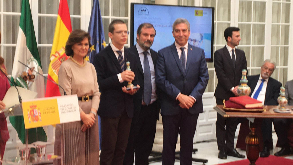 La vicepresidenta del Gobierno, ministra de la Presidencia, Relaciones con las Cortes e Igualdad en funciones, Carmen Calvo, y el delegado del Gobierno de España en Andalucía, Lucrecio Fernández, han presidido este jueves, 12 de diciembre, a las 12:00 horas, el acto de entrega de los premios Plaza de España que concede anualmente la Delegación del Gobierno de Andalucía en el que el hijo de Valentín García, de su mismo nombre, ha recogido esta mañana el premio otorgado a su padre.