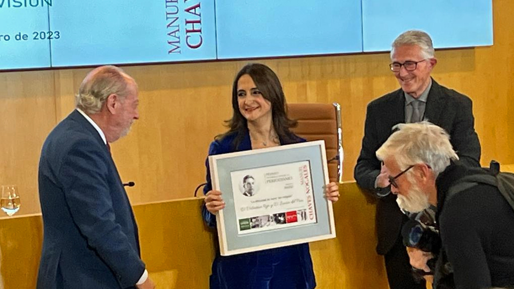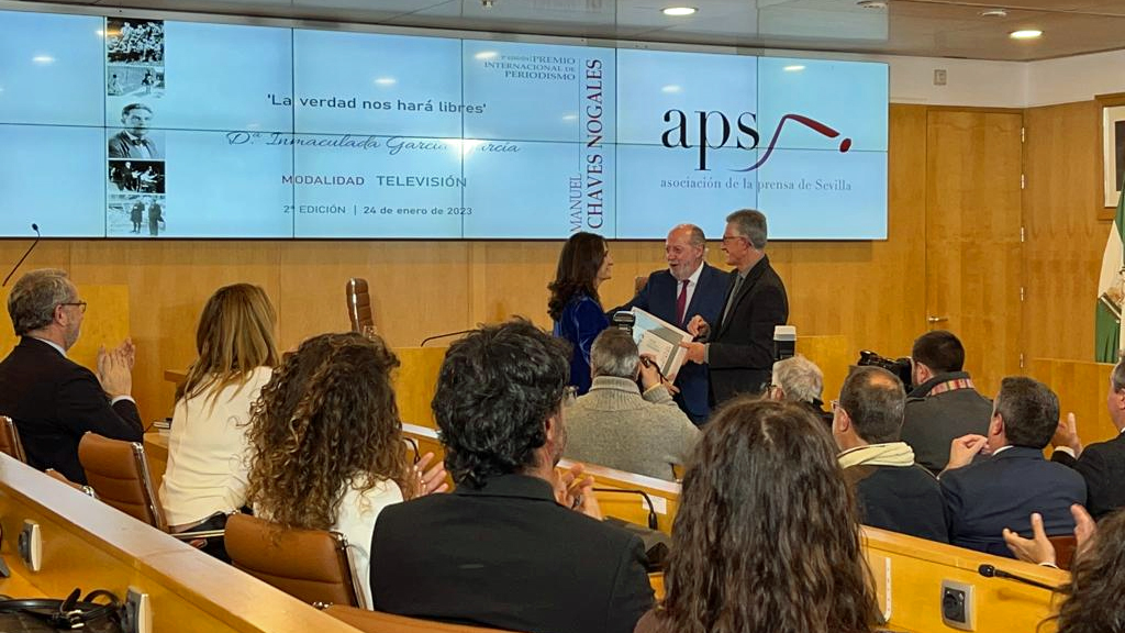 La periodista de la televisión pública de Andalucía ha recogido el premio de manos de Fernando Rodríguez Villalobos, presidente de la Diputación de Sevilla, y de Rafael Rodríguez, presidente de la Asociación de la Prensa sevillana (APS). en un acto celebrado en el salón de actos de la Diputación de Sevilla.