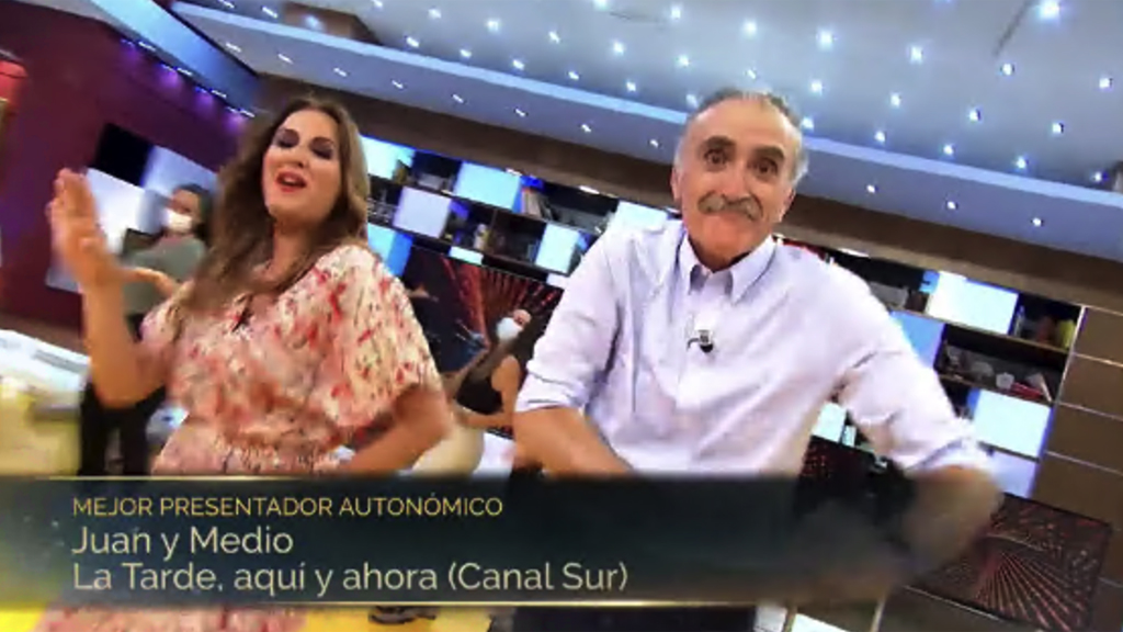 Juan Y Medio ha recogido el premio de manos de Luis Larrodera y ha comentado que "pagaría por hacer televisión, por hacer lo que hago" y ha bromeado diciendo que "estaban entre el público sus jefes, que a ver si se habían enterado...". Y Medio hizo uso de su sentido del humor personal y lo ha mezclado con sus dosis habituales de sensatez y humildad: "la televisión me ha puesto en mi lugar en el mundo, no sabría hacer otra cosa". Ha agradecido el premio a la Academia y tuvo palabras también de agradecimiento para el equipo de compañeros de Canal Sur, "que me lo ponen fácil a diario cuando llego a trabajar, después de que ellos llevan ya mucho tiempo trabajando cuando empiezo mi jornada".