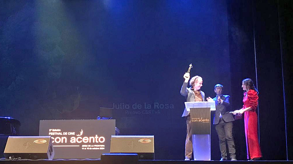 El músico y compositor jerezano Julio de la Rosa ha recibido la noche de hoy sábado 19 de octubre, en la Gala de Clausura de la II Edición del Festival de Cine “Con Acento” de Jerez, que ha sido emitida en directo por CanalSur Más, el Premio Canal Sur Radio y Televisión, de manos de Leonardo Sardiña, responsable del departamento de Cine de Radio y Televisión de Andalucía (RTVA).