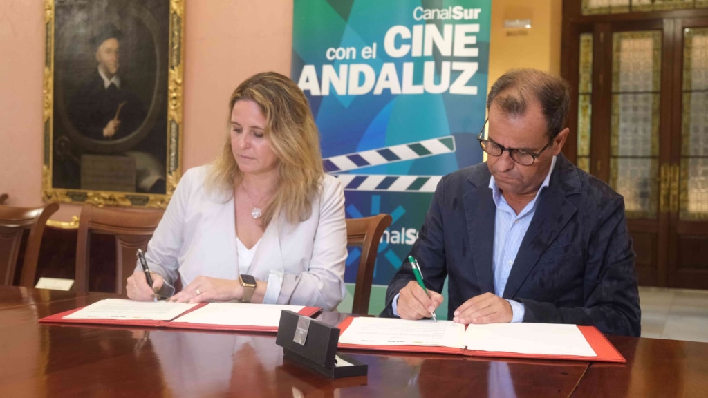 Juande Mellado, director general de RTVA y Angie Moreno, delegada de Turismo y Cultura y vicepresidenta del Instituto de la Cultura y las Artes de Sevilla (I.C.A.S) han firmado un convenio de colaboración para la promoción del certamen.