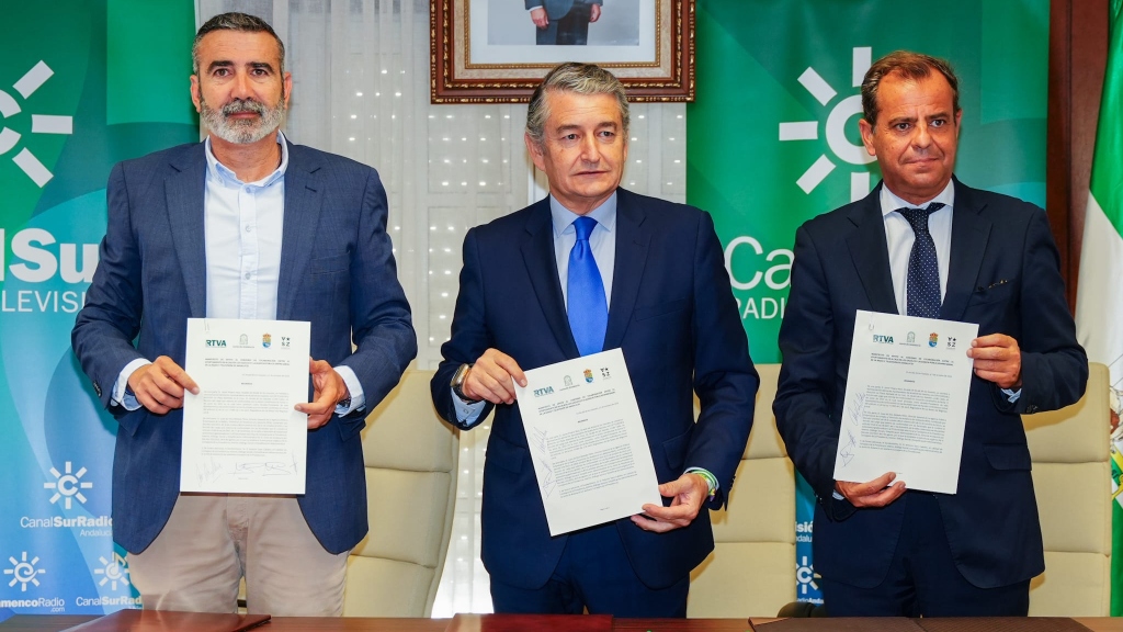 Antonio Sanz, consejero de la Presidencia, Interior, Diálogo Social y Simplificación Administrativa de la Junta de Andalucía, Juande Mellado, director general de Radio y Televisión de Andalucía y Javier Pizarro, alcalde de la localidad gaditana han firmado el convenio este jueves, 2 de octubre.
