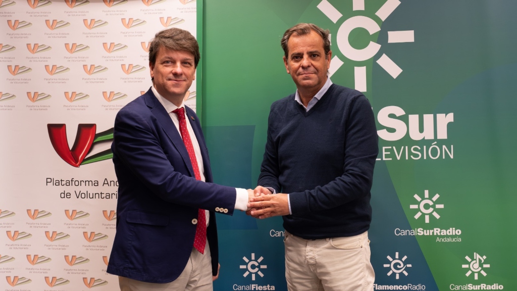El director general de Canal Sur, Juande Mellado, y el presidente de la Plataforma Andaluza de Voluntariado, Armando Rotea, han firmado el acuerdo este jueves. En el acto ha estado presente Juan Vargas, director de Innovación, Negocio y Comunicación de Radio y Televisión de Andalucía (RTVA).