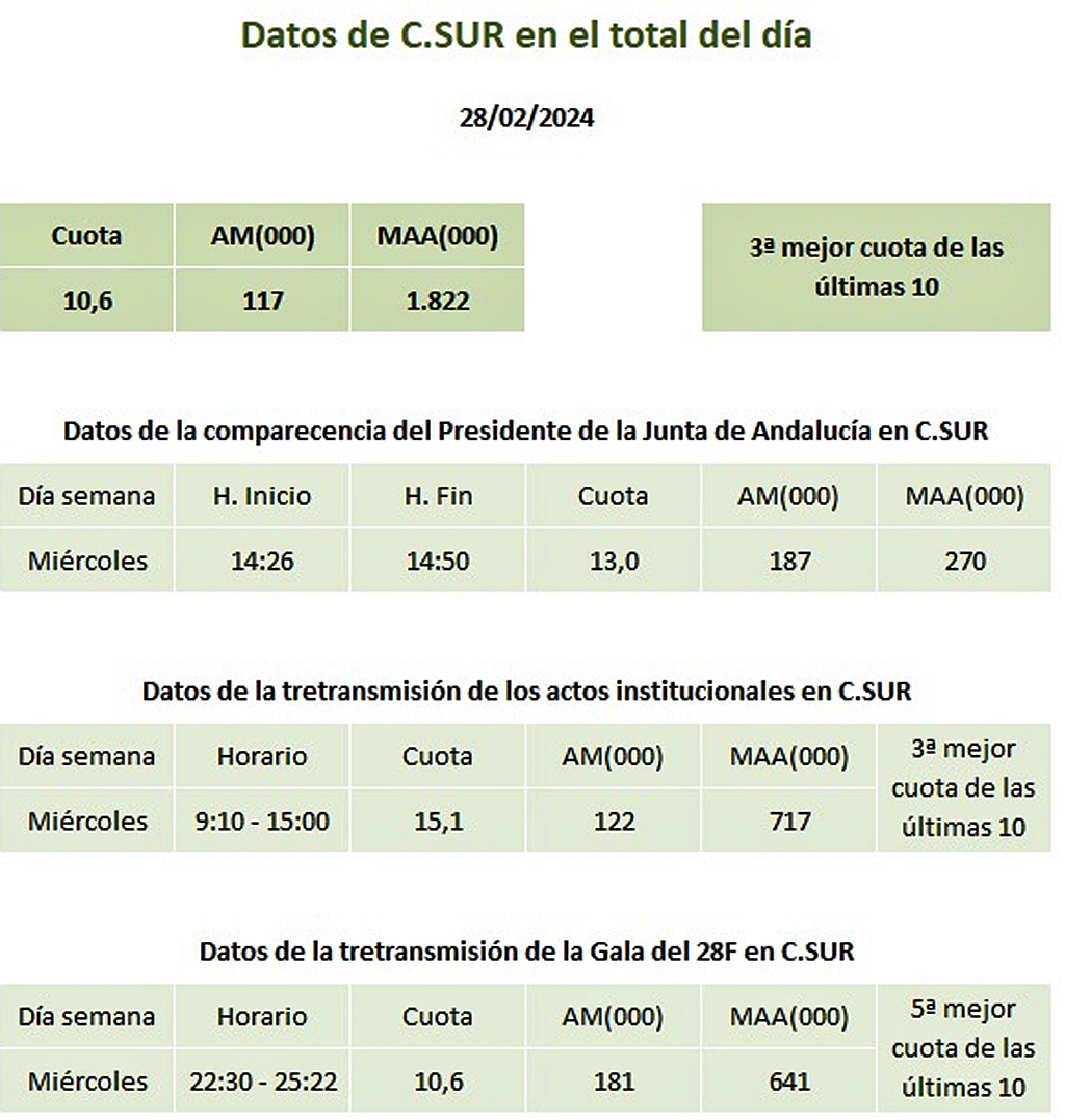Canal Sur Televisión obtuvo el “Día de Andalucía” un 10,6% de cuota de pantalla y se convirtió en la cadena pública predilecta en nuestra tierra. Un total de 1.822.000 telespectadores sintonizaron el canal de televisión pública andaluza.