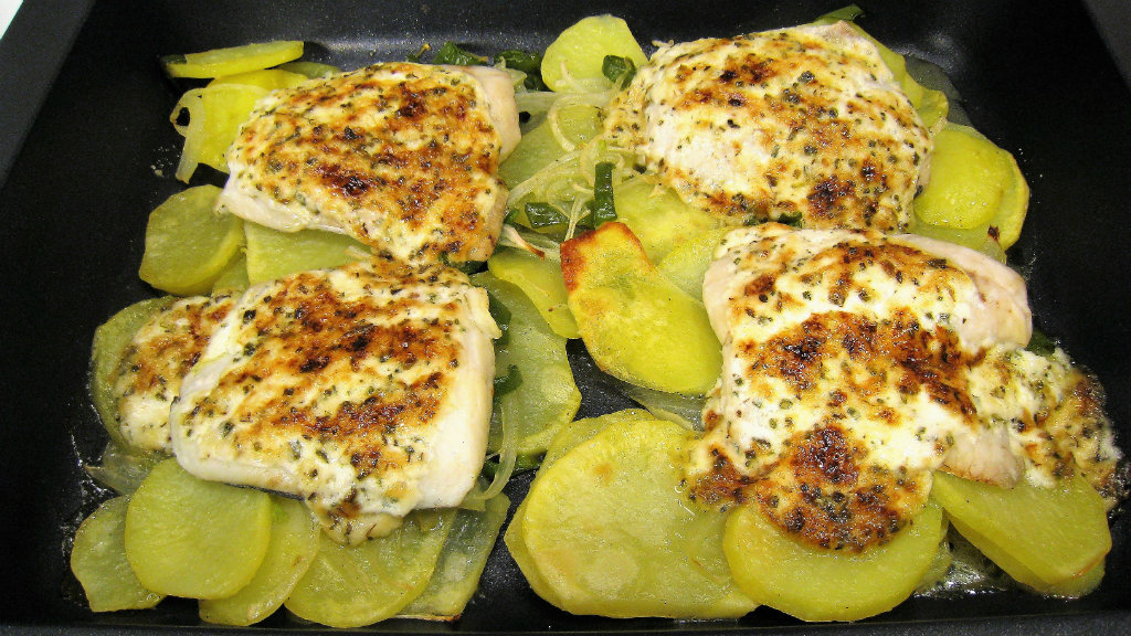El cocinero Enrique Sánchez recopila distintas sugerencias para elaborar de cara a la navidad y sugiere esta sencilla receta de pescado con una guarnición de patatas panaderas con cebolla y pimiento hechas en el microondas, que servirán de base para cocinar al horno, unos exquisitos troncos de merluza gratinada con mayonesa, limón, cebollino y orégano.