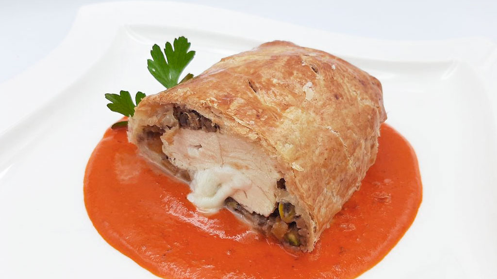 La receta de este lunes es una adaptación de la receta del solomillo Wellington, usando una rica combinación de pollo, queso, paté de perdiz, orejones, champiñones, pistachos y hojaldre; aderezado con sal, pimienta, ajo y acompañado de una exquisita y sencilla salsa de pimientos del piquillo.
