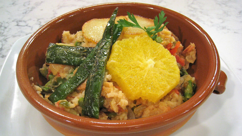 Además de 3/4 de Kg. de pan de Alfacar, se necesitan seis tomates bola, tres patatas medianas, cinco pimientos verdes, dos cebollas, un manojo de espárragos finos, dos naranjas de mesa, 100 g. de aceitunas aloreñas, aceite de oliva virgen extra, sal y pimienta.