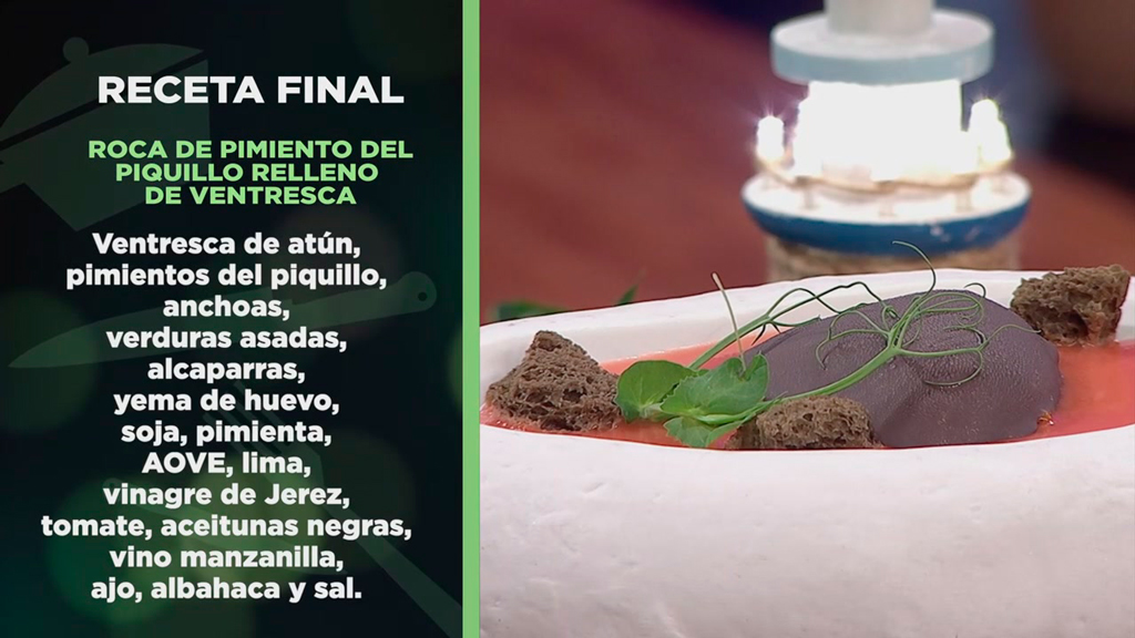 Para la gran final la receta es un aliño de pimientos rellenos de ventresca, bizcocho de aceitunas negras y emulsión de tomate, una propuesta inspirada en el típico aliño de pimientos asados con ventresca y atún de nuestra tierra, con un sabor a verano en Andalucía.