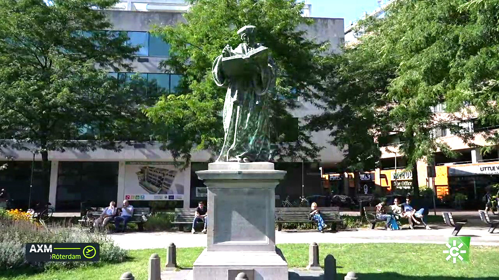 Frente a la iglesia destaca la estatua de Erasmo de Róterdam, filósofo y humanista del siglo XV, que da nombre al famoso programa europeo de intercambio universitario. La vida del pensador, marcada por los viajes y la búsqueda del conocimiento, refleja el espíritu del programa Erasmus, que fomenta la movilidad estudiantil y el intercambio cultural.