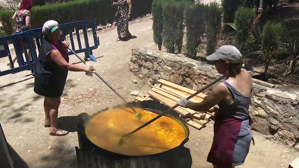 Tras la procesión y el lanzamiento, Natalia conoce a Rafael Gálvez, paellero de las fiesta desde hace 20 años, que nos cuenta el secreto de su paella: buenos ingredientes y agua de Lanjarón.