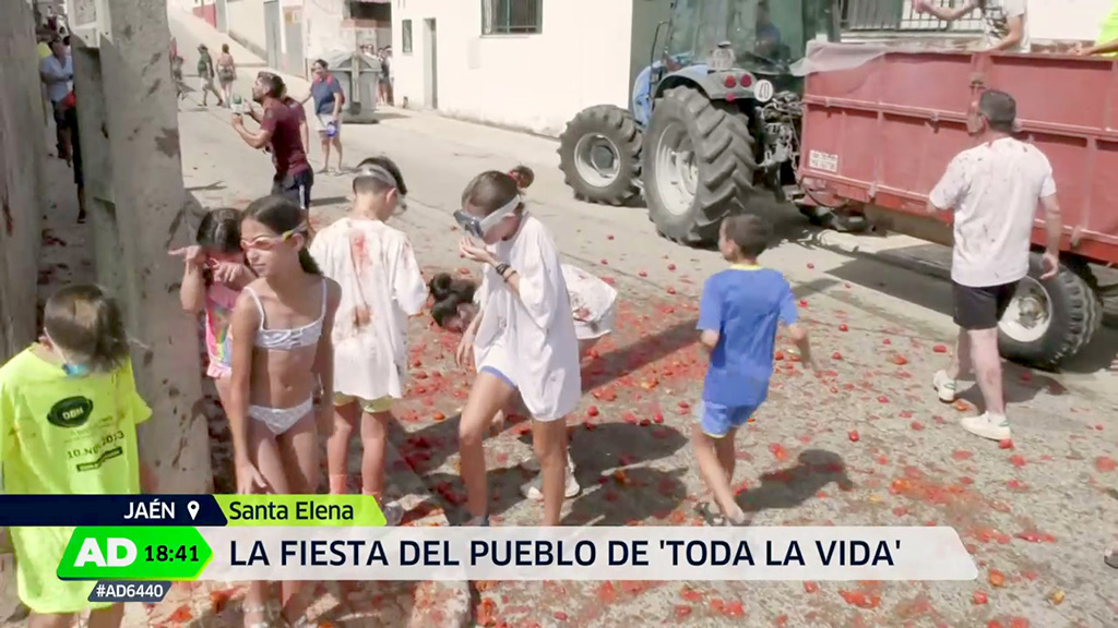 El intrépido reportero Eloy Moreno, participa también en la batalla de tomates, incorporada recientemente a la fiesta, queriendo emular la famosa tomatina de Buñol y que tiene especial éxito entre los más pequeños.