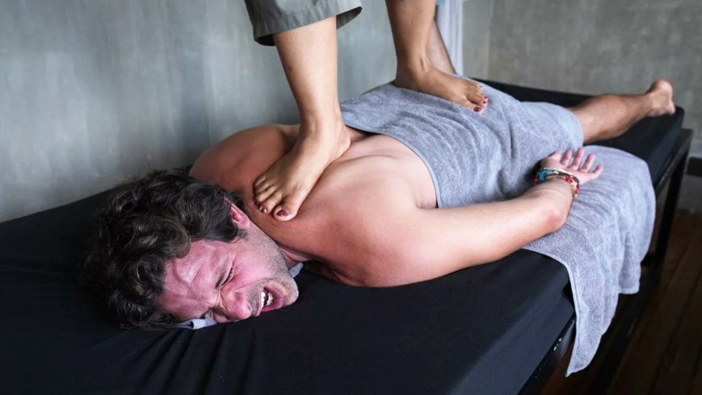 Para liberar el estrés de nuestro reportero, Adolfo lo lleva a disfrutar de un masaje balinés en el que se estimulan 107 puntos del cuerpo llamados "marmas". Aunque no sabemos si Rafa lo disfrutó.