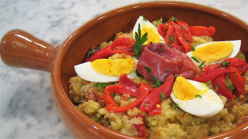 El ajo campero o ajo caliente se sirve en una cazuela con huevo cocido por encima, jamón picado, tiras de piquillo y perejil picado.