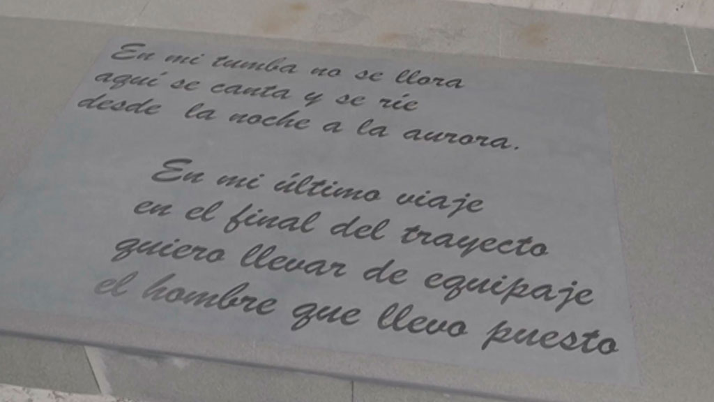 Acudimos junto a dos de sus hijos de su primera mujer, María Vega, hasta el cementerio de su ciudad natal Torredelcampo, Jaén, donde podemos leer su epitafio: "En mi tumba no se llora, aquí se canta y se rie desde la noche hasta la aurora. En mi último viaje, en el final del trayecto, quiero llevar de equipaje el hombre que llevo puesto".