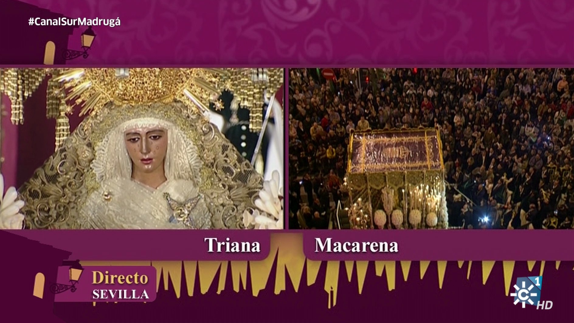 Canal Sur Televisión ha restransmitido desde la medianoche y hasta cerca de las diez de la mañana "La Madrugá" de Andalucía. Previamente Enrique Romero presentó un programa especial con conexiones con las 8 capitales andaluzas desde las distintas Carreras Oficiales, con una apuesta por una retransmisión pausada y de calidad de los desfiles procesionales.