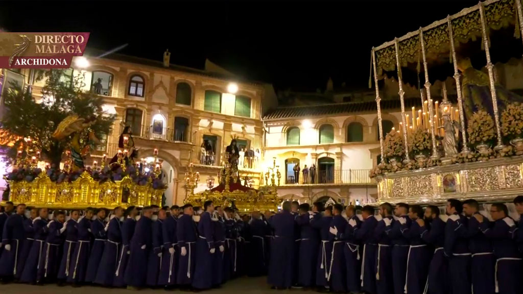 Además, asistimos a otro momento muy especial con el hermanamiento de los tres tronos titulares de la Cofradía del Huerto: el de la Virgen del Amparo, el Señor del Huerto y Jesús Preso, que confluían en la preciosa plaza ochavada de esta localidad malagueña. Una imagen espectacular con los horquilleros que portan los tres tronos (unos 200 en total) que mecen las imágenes al unísono, al compás de las bandas de música y cantando la salve entre todos.