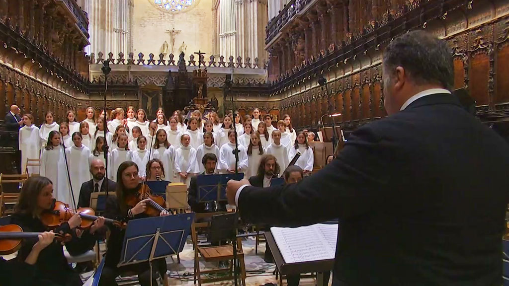 La Escolanía de la Catedral de Sevilla entona "El sol es tu vestido", que acompañan la danza.