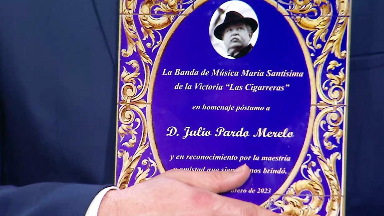 Además, fue un fervoroso devoto de la Esperanza de Triana, para la que compuso muchas marchas procesionales, entre ellas 'Pureza Marinera', con la que la Banda de la Cigarrera le ha querido rendir un homenaje en el programa. Además, su director le regala una placa en agradecimiento, por su labor y amistad, al hijo de Julio Pardo.