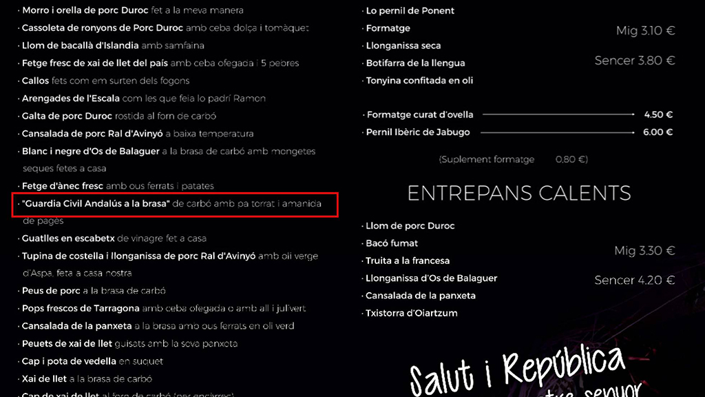 Un restaurante de la localidad de Balaguer, en Lérida, incluye en su carta de comidas un plato con el nombre 'Guardia civil andaluz a la brasa de carbón'.