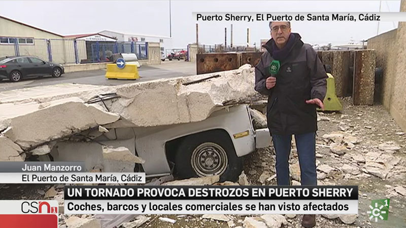 El tornado provocó la caida de un muro sobre un vehiculo que quedó destrozado. Tambien han sufrido daños varios barcos atracados en el varadero de Puerto Sherry. Esta mañana se evaluan daños en este puerto deportivo gaditano. El fuerte viento ha encallado barcos, se ha llevado por delante coches aparcados, y ha provocado daños en terrazas y establecimientos. El ciclón tocaba tierra desde el mar por el faro del espigón del puerto.